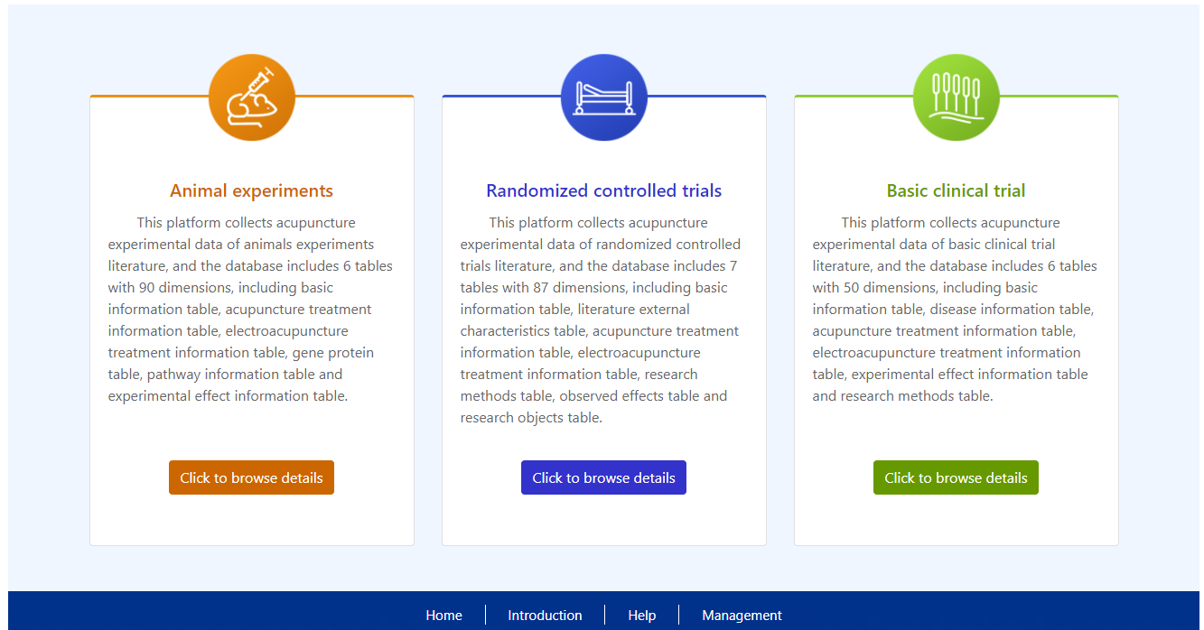After logging in to the system, you can use the retrieval function of three modules: "Animal experiment", "randomized controlled trial" and "clinical basic experiment".