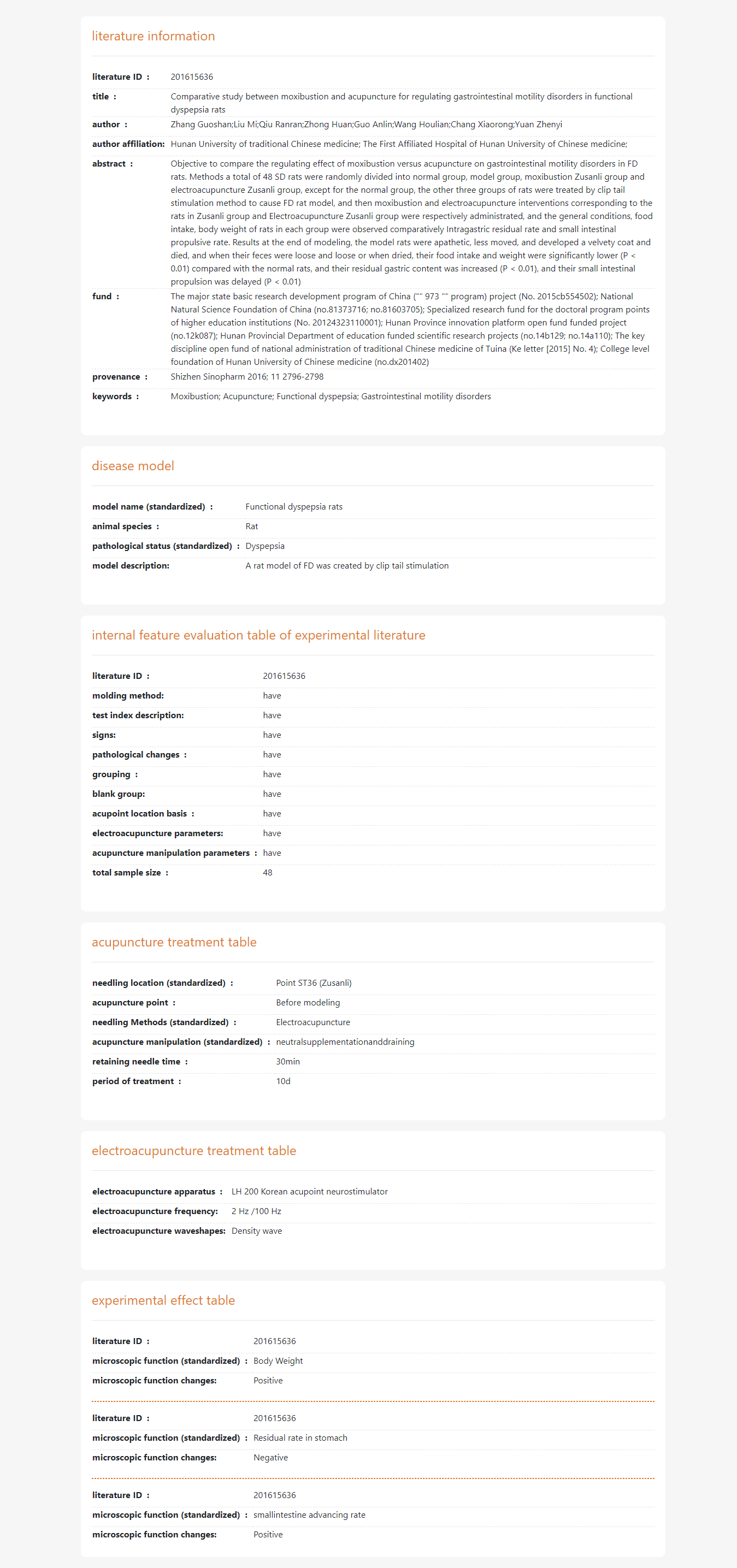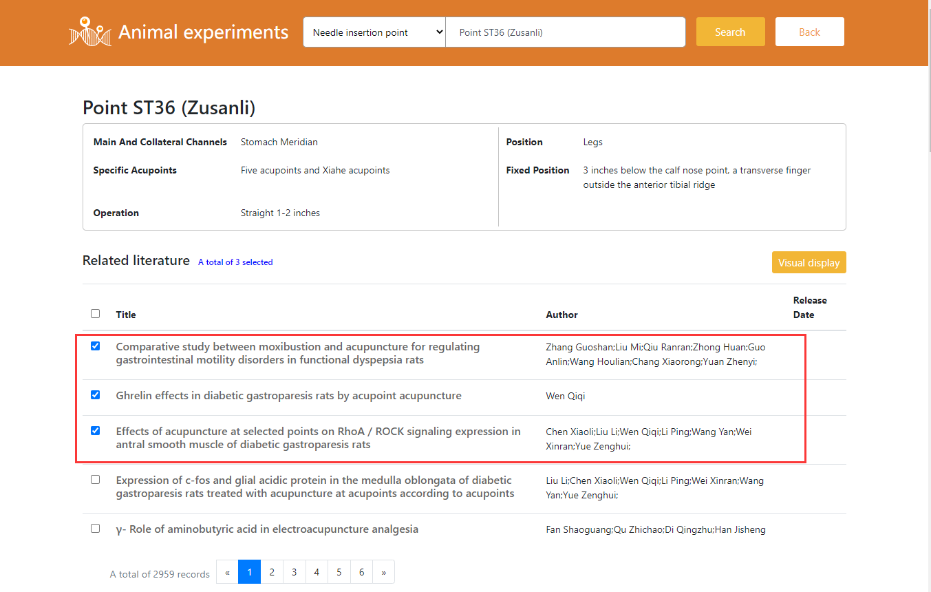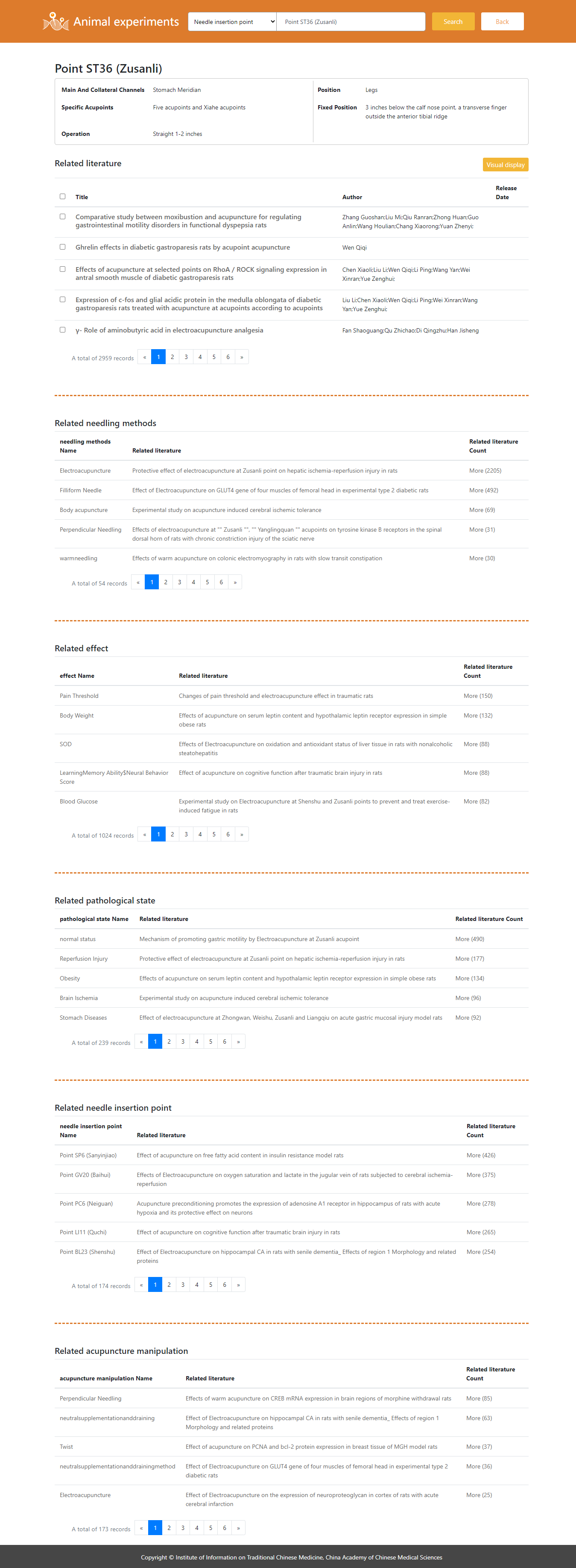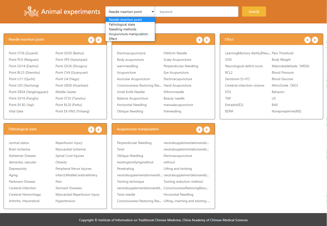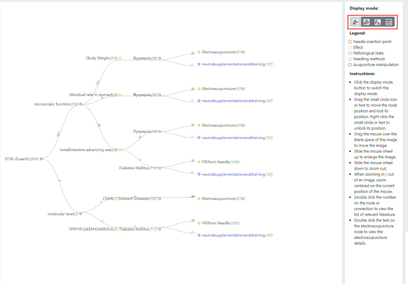 Acupuncture Effect Data Visualization Platform is constructed by Institute of Information on Traditional Chinese Medicine, China Academy of Chinese Medical Sciences. Based on the literature database of acupuncture effect, it will display acupuncture intervention data (needles, acupuncture manipulation, needle sites, courses of treatment, etc.) and acupuncture effect information (functional score, microscopic function, tissue or cell level, molecular level, etc.) in detail. The database is divided into three modules, including 14,284 articles from 1956 to 2019 in the acupuncture animal experiment module, 11,472 articles from 1956 to 2016 in the acupuncture randomized controlled trial module, and 2,107 articles from 1956 to 2019 in the acupuncture basic clinical experiment module respectively. The platform can support the retrieval and screening of literature, and provide five search portals of disease syndrome, acupoint, effect, therapy, and tissues or organs, so as to accurately screen literature data. At the same time, the platform provides 3 visualization methods, including tree mode, circle mode, and mesh mode, using knowledge network to display the relationship of disease, acupoints, genes, proteins, detection indicators, cell or tissue and other interrelated elements.